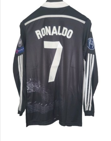 - The product is a third black dragon long sleeve soccer jersey in size L, representing Real Madrid from the 2014-2015 season. This fan apparel is designed for men who support the team and features the iconic CR7 jerseys. The black color and sleek design make it a stylish and comfortable choice for any soccer fan looking to show their allegiance to Real Madrid.