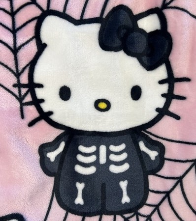- The Hello Kitty Skeleton Spiderweb Halloween Plush Throw Blanket in pink and black is a cozy and whimsical addition to any bedroom. This rectangular throw, measuring 50 x 70 inches, features a spooky spiderweb pattern with a cute Hello Kitty character design. Made from 100% polyester, this Sanrio-branded blanket is perfect for teens, adults, and kids alike, adding a touch of fun to your home decor during Halloween season or year-round. The soft material and cute pattern make it a must-have for Hello Kitty fans and Halloween enthusiasts alike.