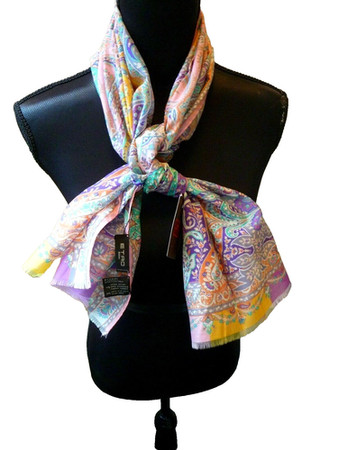 - Of course, made in Italy of 70% cotton and 30% silk with Etro woven on one end. This elegant scarf wrap looks different every way it's tied or draped, and if I didn't own way too many scarves already, it wouldn't be up for sale!