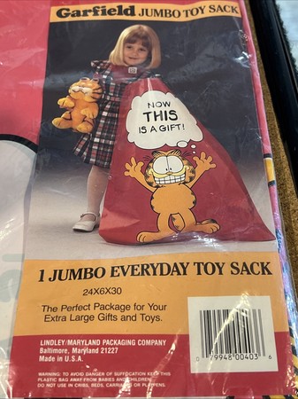 - This vintage Garfield jumbo toy sack gift bag is a must-have for any fans of the classic animated series. Measuring 24x6x30 inches, it is made of durable plastic and features a colorful design with the iconic Garfield character. The bag is perfect for carrying all kinds of gifts and merchandise, making it an ideal choice for collectors and enthusiasts alike. The bag is brand new and sealed, making it a great addition to any collection. With its unisex design and versatile size, it is perfect for anyone who loves Garfield and wants to show off their love for the character. Don't miss out on this unique and rare piece of animation merchandise!