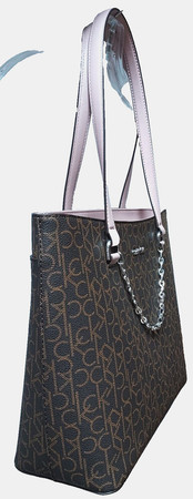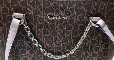 - CALVIN KLEIN Leather tote/shoulder bag,double handles.Monogram brown,pink leather trim handles,top of bag.Zipper closure,zip tab has silver at the end with Calvin Klein.Silver chain accent in front.Silver Calvin Klein Logo at center.Back ,slip pocket with snap button.