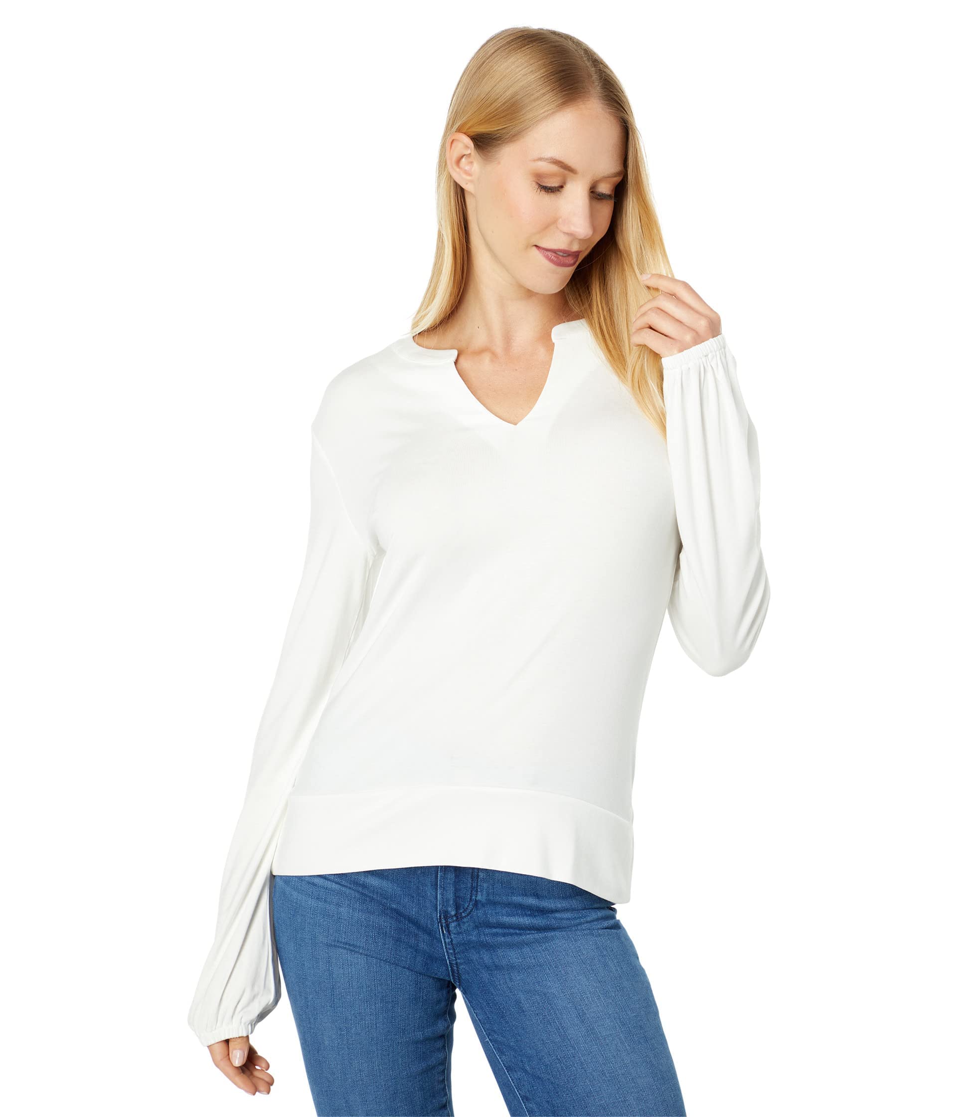 Variegated rib sweater with a slight balloon sleeve. Model is 5'9.5" and wearing a size small. 83% Viscose, 17% Polyester. Machine Wash Cold, Do Not Bleach, Lay Flat To Dry, Cool Iron If Needed, Or Dry Clean. Imported. Roundneck. Three-quarter sleeves. Pullover style. Elasticized cuffs.