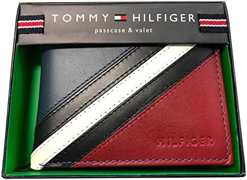 Características de la billetera plegable Tommy Hilfiger Passcase y Valet: cuero genuino, rayas de bloques de color y relieve de la marca, 7 ranuras y compartimento para billetes, funda para pasaporte extraíble con 2 ranuras con ventana de 3.5 x 8.5 pulgadas cuando está abierta.