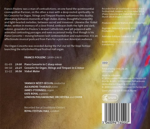 This release is the sixth on the LPO label conducted by Yannick Nézet-Seguin. The performances on this album, recorded in 2013 and 2014, were part of his final season as Principal Guest Conductor. The Organ Concerto was performed by James O'Donnell as part of the Pull Out All The Stops festival, celebrating the restoration of the Royal Festival Hall organ, which had been out of use since 2005. These performances were very well reviewed at the time: "Yannick Nézet-Séguin is a master-painter and drew a rich spectrum of colours from the London Philharmonic Orchestra to decorate each of these scores in a distinctive way" (Bachtrack). "Yannick Nézet-Séguin [was] alive to the solemn and dramatic aspects of Poulenc's setting, it's radiance, jauntiness, pealing vitality and ritual dance" (Classical Source). The album features performances from star soloists: organist James O'Donnell; soprano Kate Royal; pianist Alexandre Tharaud. The Times said of the Organ Concerto: "under the meticulous direction of Yannick Nézet-Séguin, the London Philharmonic Orchestra's strings formed a pale gold halo around the organ as James O'Donnell navigated the crazy-mirror harmonies of Poulenc's concerto with brisk, unflappable agility."