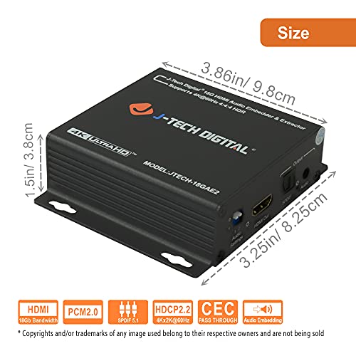 J-Tech Digital 4K 60HZ HDMI Audio Extractor with Audio Embedder Optical SPDIF + 3.5MM Output Supports HDMI 2.0, 18Gpbs Bandwidth, HDCP 2.2, Dolby Digital/DTS Passthrough CEC, HDR10 [JTECH-18GAE2]