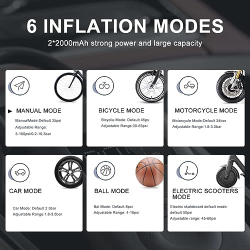 - INFLADO INTELIGENTES: con 6 modos de inflado preestablecidos, este inflador de neumáticos portátil puede satisfacer fácilmente sus diversas necesidades de inflado. Los modos preestablecidos incluyen los modos de coche, moto, bicicleta, pelota y patinete eléctrico, lo que lo hace fácil de usar para los principiantes. También hay un modo manual que te permite ajustar la presión deseada entre 3 y 150 psi para diferentes inflables.