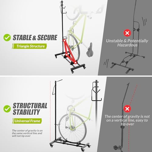 - No-Wall-Damage Design & Easy Assembly: Unlike traditional wall-mounted storage, this freestanding bike stand for indoor riding requires no drilling or wall damage. Setup takes just minutes with the included instructions and tools. It's perfect for renters, offices, or clean garages where wall integrity is important.