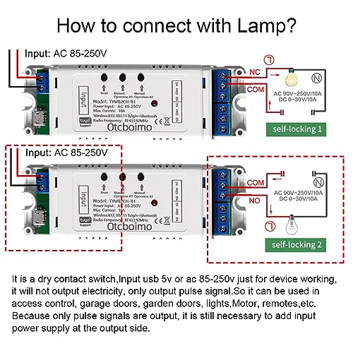 - 3 Working Models:"Self-locking mode", "Interlocking mode" and "Inching mode" to meet different needs. Two Working Voltage: USB 5V/AC85-250V.The device is equipped with potential-free outputs (dry contacts), providing high flexibility in voltage support and various applications.