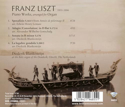 The organ played a relatively large part in Franz Liszt's oeuvre, and there are dual organ and piano versions of a number of his works, but some of the pieces specifically intended for piano also translate well to the organ. This album consists of four organ transcriptions of such piano works. It begins with a wedding (Sposalizio) and ends with a funeral procession (La lugubre gondola), both life moments often associated with church and therefore with the organ, and Liszt employs a church-bell motive in them. In the Sposalizio, as well as in the Adagio (Consolation in D flat) that follows on this programme, there is a typical 19th-century musical religiosity that was also very characteristic of Liszt. His monumental Sonata in B minor is then succeeded by La lugubre gondola, a dark epilogue once again emphasising Liszt's musical progressiveness and emotional depth. The heart of this album is the Sonata in B minor in a new transcription. Although it has already been transcribed for organ, the present transcription is specifically intended for the 18th- or 19th century Dutch metropolitan type of organ, an outstanding example of which is the main organ at the Domkerk (St. Martin's Cathedral), Utrecht. There is even a historical link between this particular instrument and Liszt's organ repertoire. In the summer of 1856, Liszt's student Alexander Winterberger (1834-1914) undertook a tour of the Netherlands, including a performance at the Utrecht Domkerk, which was positively received by the press, with Liszt, too, enthusiastic