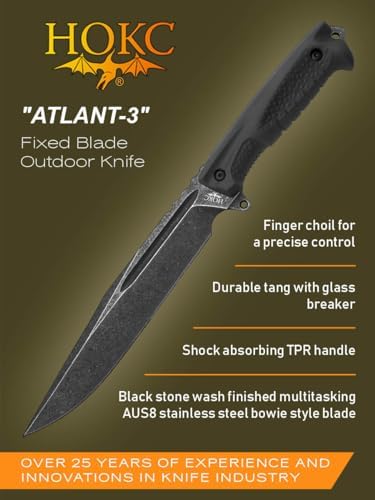 HOKC Atlant-3 | 606-589821 | Hunting Knife, Tactical Knife by Official Dealer - Designed by Russian Master Aleksander Biryukov - Advanced Guard, Finger Choil, TPR Handle, Durable Tang, Glass Breaker, Long and Durable AUS8 Stainless Steel, Black Stone Wash Finished - Ideal for Camping & Hunting