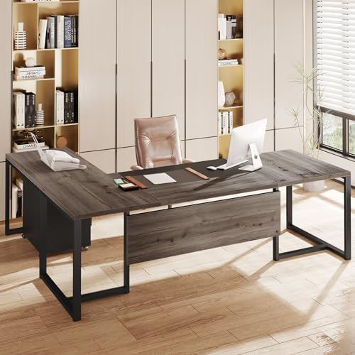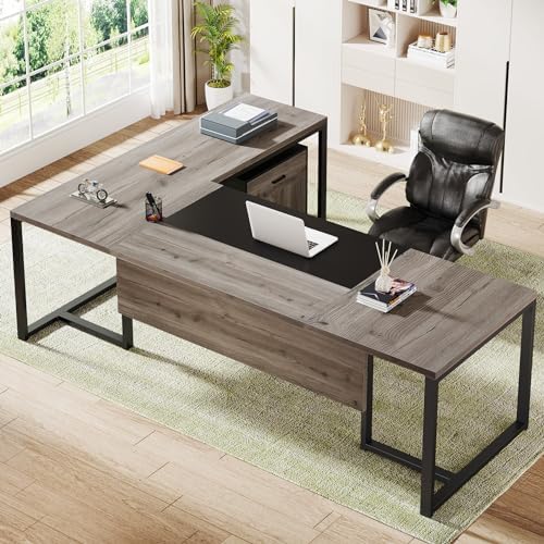 Tribesigns 70.8" L-Shaped Executive Desk with Drawer Cabinet, Large Executive Office Desk with Separate File Cabinet, Home Office Desk Workstation Business Furniture Set, Retro Gray