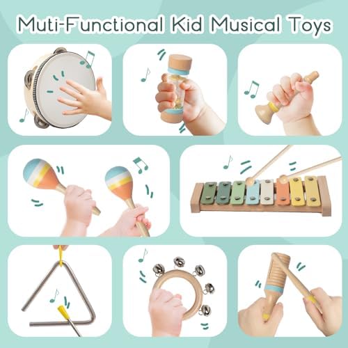 - Wooden Instruments Playset:Our toddlers musical instruments set is designed to cultivate your child's love for music! This toddler music toy set includes an early musical education songbook with 13 kids' songs, 8-tone xylophone with mallets, a tambourine with cymbals, two maracas, a trumpet, a triangle with striker, a wood sounder, a hand bells, and a rainmaker, inviting your little maestro to explore a world of sounds.This is the perfect set of musical instruments for toddlers