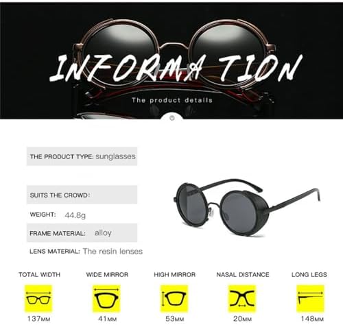 Model Number:Men SunglassesLens Width:45 MMLens Height:56 MMLenses Material:PolycarbonateDepartment Name:AdultGender:MENFrame Material:AlloyLenses Optical Attribute:MIRROR,UV400Style:RoundItem Type:EyewearEyewear Type:SunglassesUsage Scope:Shopping ,Party ,Travel,T Show,Outdoor DrivingGender:Men & Women Boys & Girls Youth Male & FemaStyle:Rock,Punk,Fashion Vintage Retro Style Sun GlasCharacteristic:Lunette de soleil ronde lentes de sol mujer marc1.Joker glasses to modify the face shape,The choice of fashionable travel collocation, make you more outstanding.2.Fashion, comfortable and cool to wear,classic design, visual unlimited.3. UV PROTECTION LENS - Unisex sunglasses are coated with UV400 protection, it can block harmful UV Rays, Polarized lenses can reduce glare, eliminate reflected light and scattered light, restore true color, and protect your eyes perfectly.4. PERFECT DETAILS - High-strength PC frame, integral nose pads, reinforced metal hinges, all the details make it more comfortable and durable.5. CLASSIC & FASHION DESIGN - It is suitable for fashion daily collocation, also the perfect choice for outdoor activities, such as driving, shopping, traveling, fishing and so on.