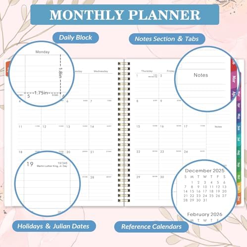 • 2026 Monthly Planning - Each monthly page has large daily blocks (1.8" x 1.9") for you to make detailed daily plans. Important holidays are marked in advance to remind you of special days. There is also a dedicated section for to-dos and notes, which helps you clearly organize tasks and ideas and improve work efficiency. With 12 colorful monthly tabs, you can quickly locate specific months and find information more conveniently.