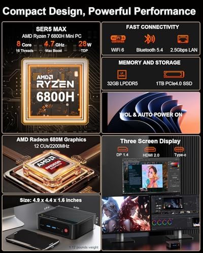 - 【4K UHDTriple Display】SER5 MAX mini desktop computer supports triple screen display via 1*HDMI2.0 (max 4K 60Hz)+1*DP1.4 (max 4K 144Hz)+1*Type-C (max 4K 120Hz), which enables multi-task easily. You can also expand your viewing area across three monitors to enjoy better gaming experience