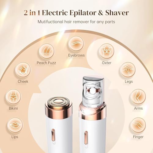 - 🌺【2 in 1 Hair Removal Device】The Facial Hair Removal Epilator for Women can remove peach fuzz and hair from lips, chin, neck and cheeks or use as an eyebrow shaper to maintain perfect brows , or instead of, waxing and plucking. This Epilator for Women allows anyone to painlessly remove unwanted hair by simply pressing to the face and making small circular motions, leaving skin smooth and hair-free.
