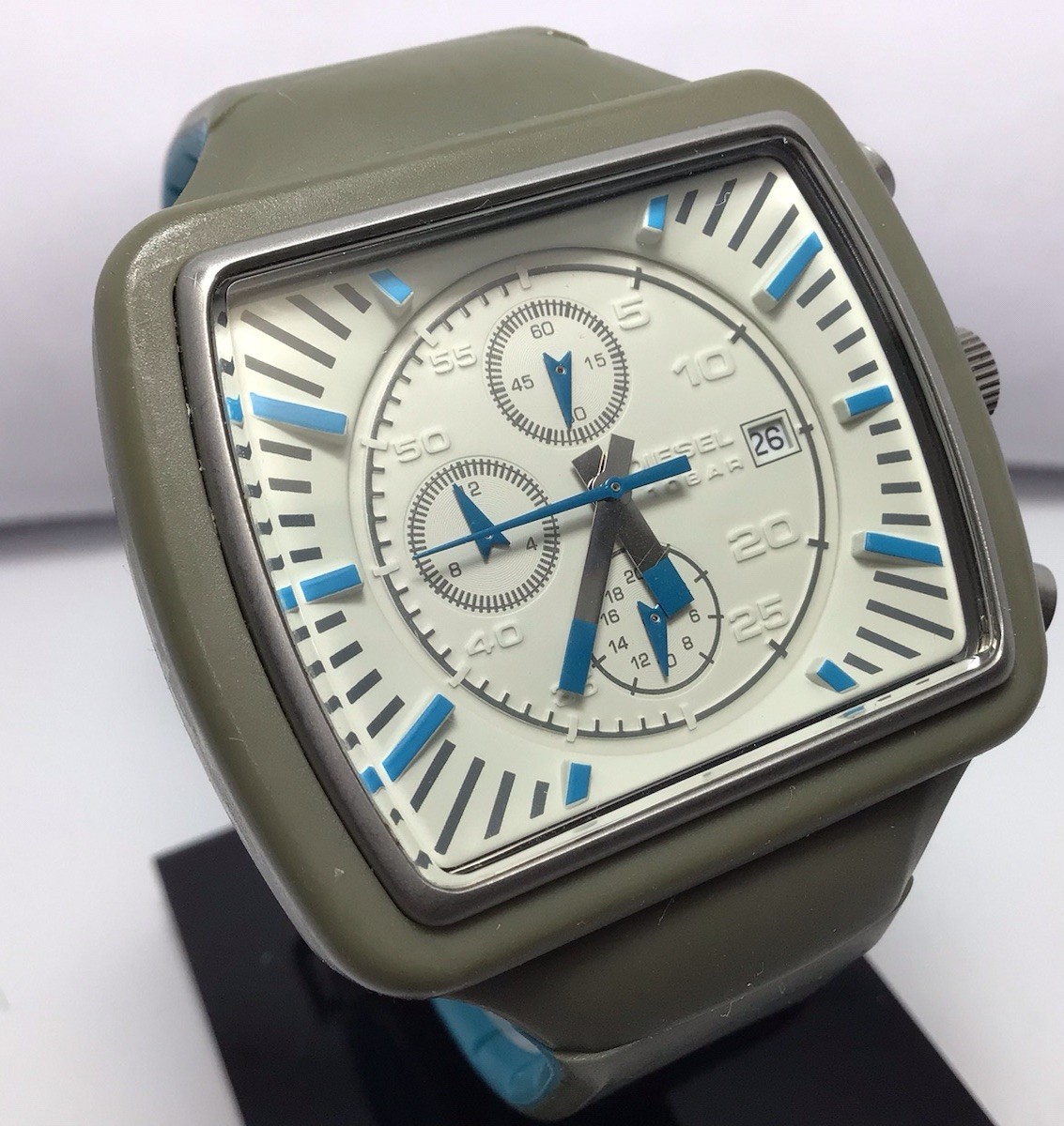 Diesel Men’s Watch. Preowned in used condition. Quartz Japan movement, analog display, solid stainless case back. Crystal has a few scratches but still very functional, back case has some scratches, bezel and case has some scratches and wear. Watch has a nice dial design with 3 chronograph sub dials. Watch is water resistant 100 meters/330 feet. Band is resin original in used condition with black band retainer that is not original. Watch keeps accurate time and has a new silver oxide battery. Case width with crown is approx 48.8mm. Wrist size is up to 8 and 1/4 inches. Listing is for a used watch in working condition with no box or booklet.