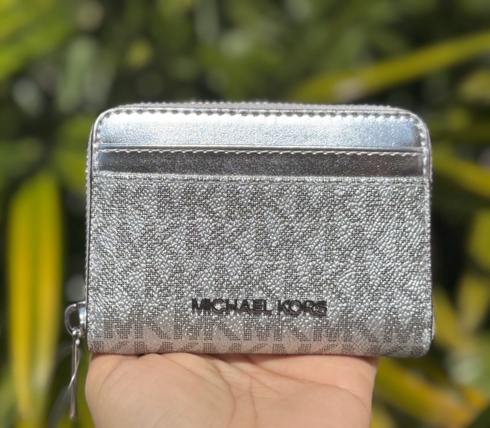 MICHAEL KORS JET SET TRAVEL MD ZIP AROUND CARD CASE WALLET MK SILVER