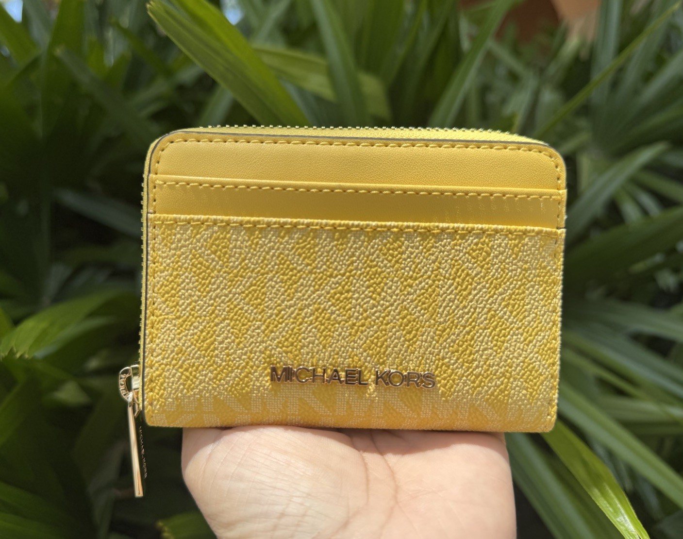 MK Signature. Daisy Yellow. Zip Around Closure. Gold Toned Hardware. 2 Credit Card Slots at Back. Custom Fabric Lining.