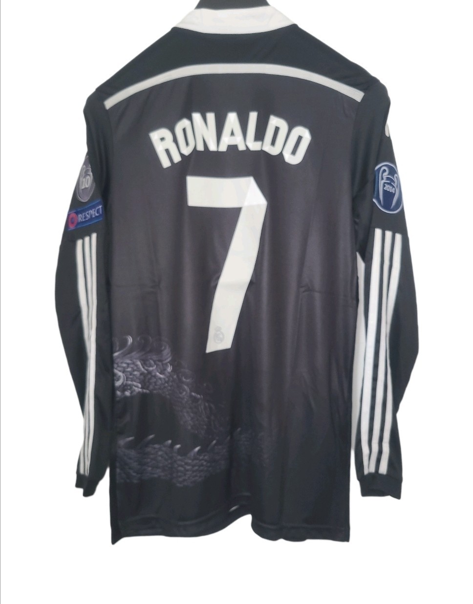 The product is a third black dragon long sleeve soccer jersey in size L, representing Real Madrid from the 2014-2015 season. This fan apparel is designed for men who support the team and features the iconic CR7 jerseys. The black color and sleek design make it a stylish and comfortable choice for any soccer fan looking to show their allegiance to Real Madrid.