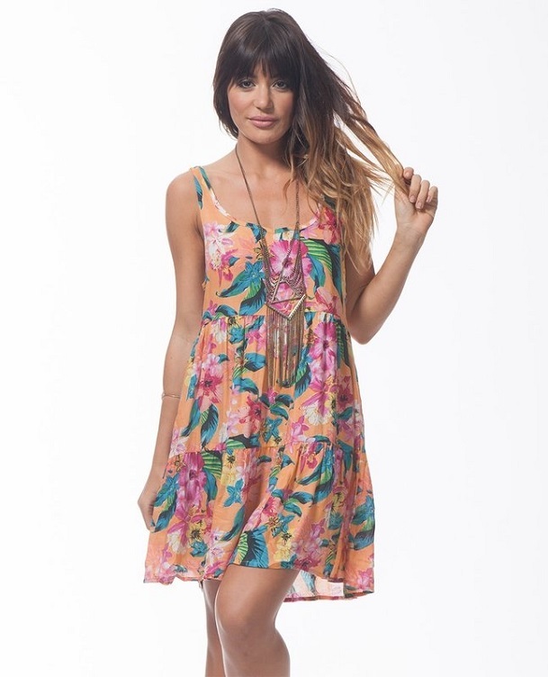MODEL: PARADISO COVER UP. RIP CURL CLOTHING. TIERED SKIRT. COLOR: LIGHT ORANGE. 100% RAYON MOSS WITH FLORAL PRINT.