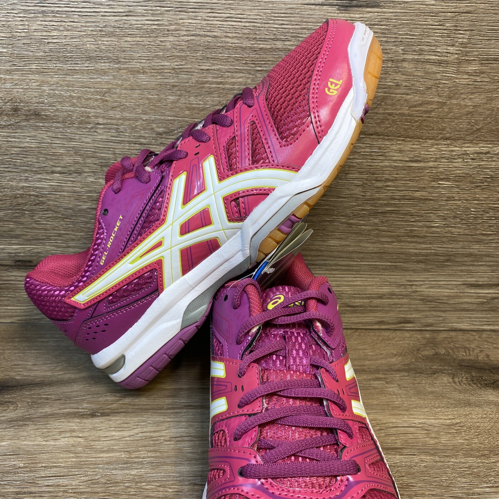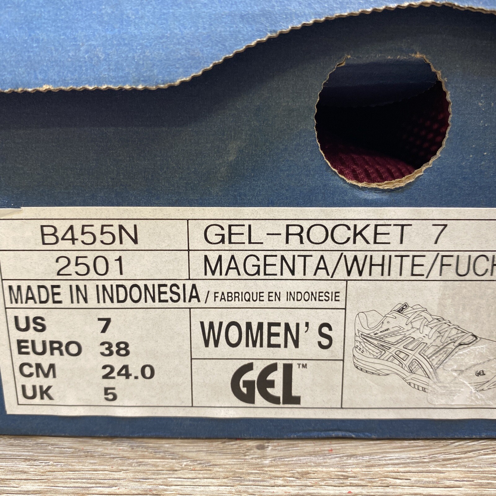ASICS GEL-ROCKET 7 Volleyball Court Shoes Magenta / White / Fuchsia Women’s Size 7 NEW. B455N Hard to find these court, gum rubber bottomed shoes. Amazon has a few and is selling them for $93. Please see all pictures as they are the main part of the item description. Ask if you have any questions. Thanks! Bin: 44