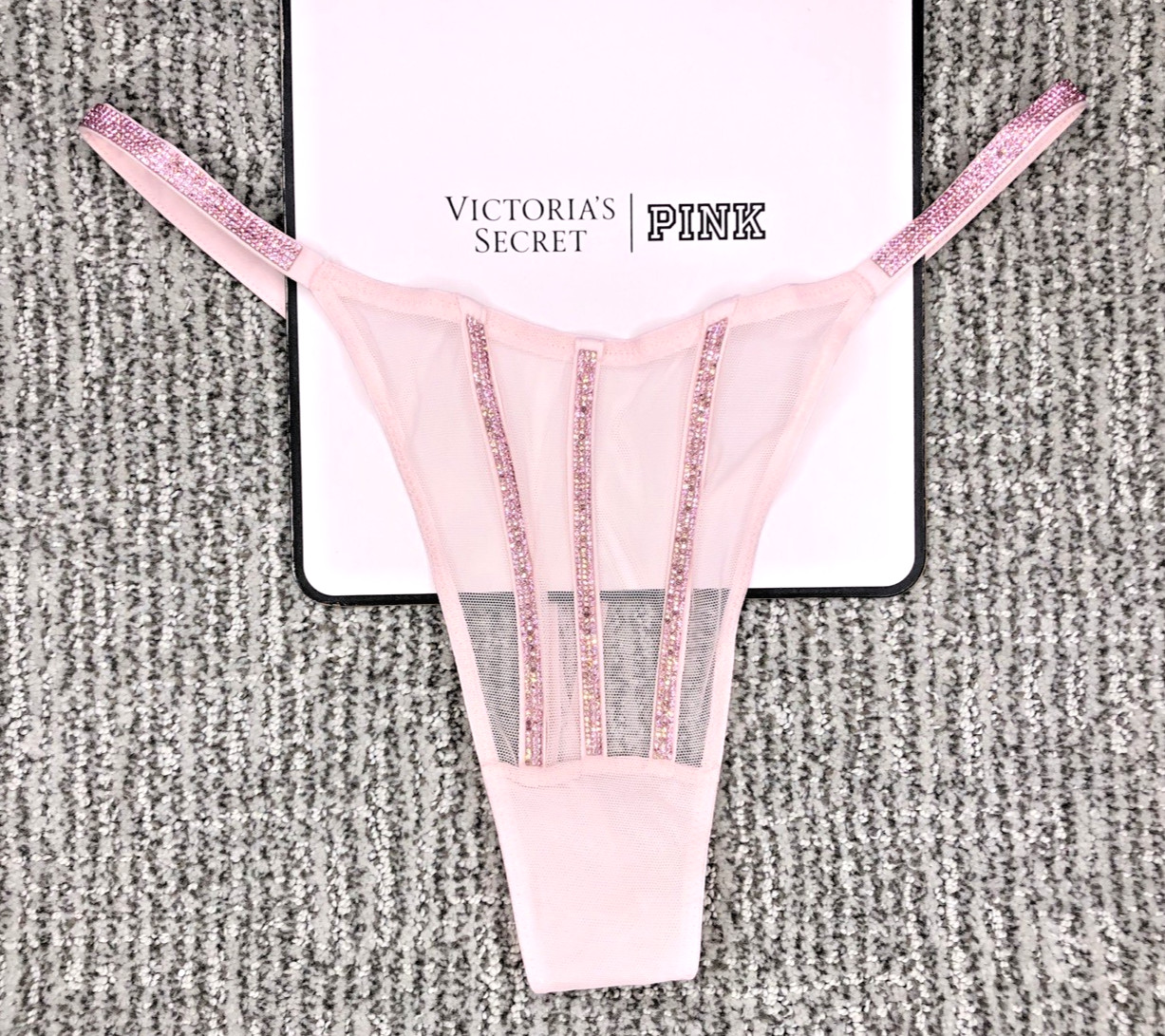 Victoria's Secret Very Sexy NWT Large Pink Sheer Shine Rhinestone Thong Panty