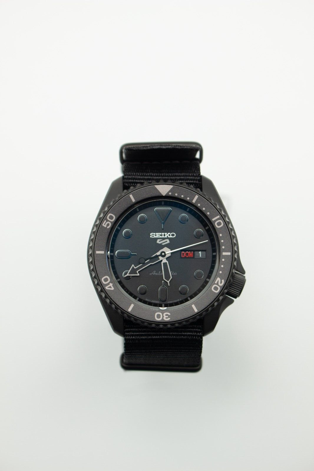 Collection Seiko 5 Sports. Band Material Nylon. Band Type Two-Piece Strap. Case Material Stainless steel case with black ion finish. Band Color Black. Analog 3 Hands.
