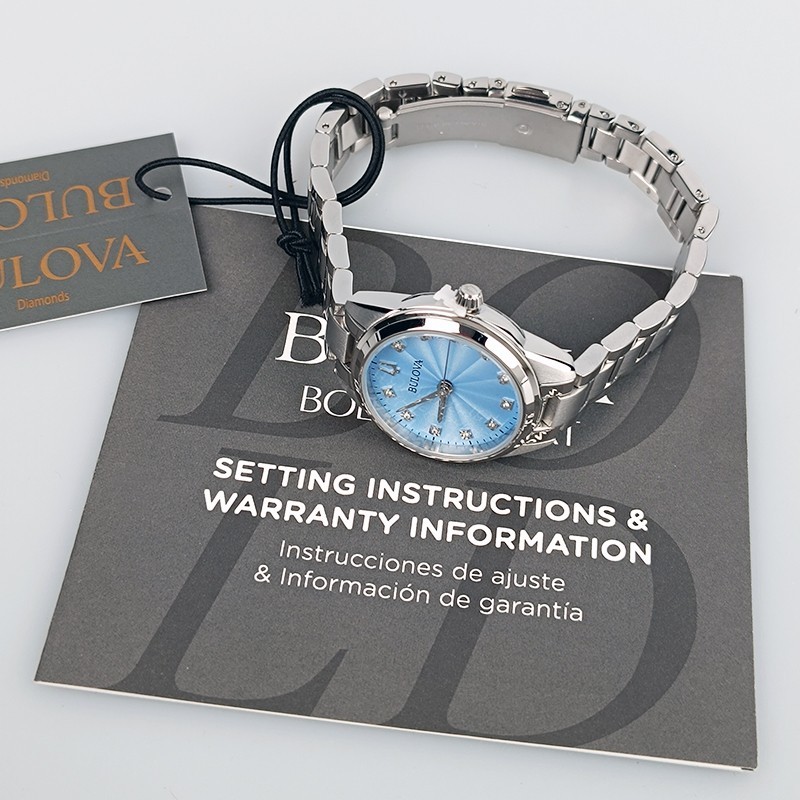 Model: 96P250. Series: Sutton. Dial: Light Blue, Diamond Accents. Glass Type: Sapphire Crystal. Bracelet: Stainless Steel. Case Material: Stainless Steel. Clasp: Short Fold Over Clasp with Push Buttons.