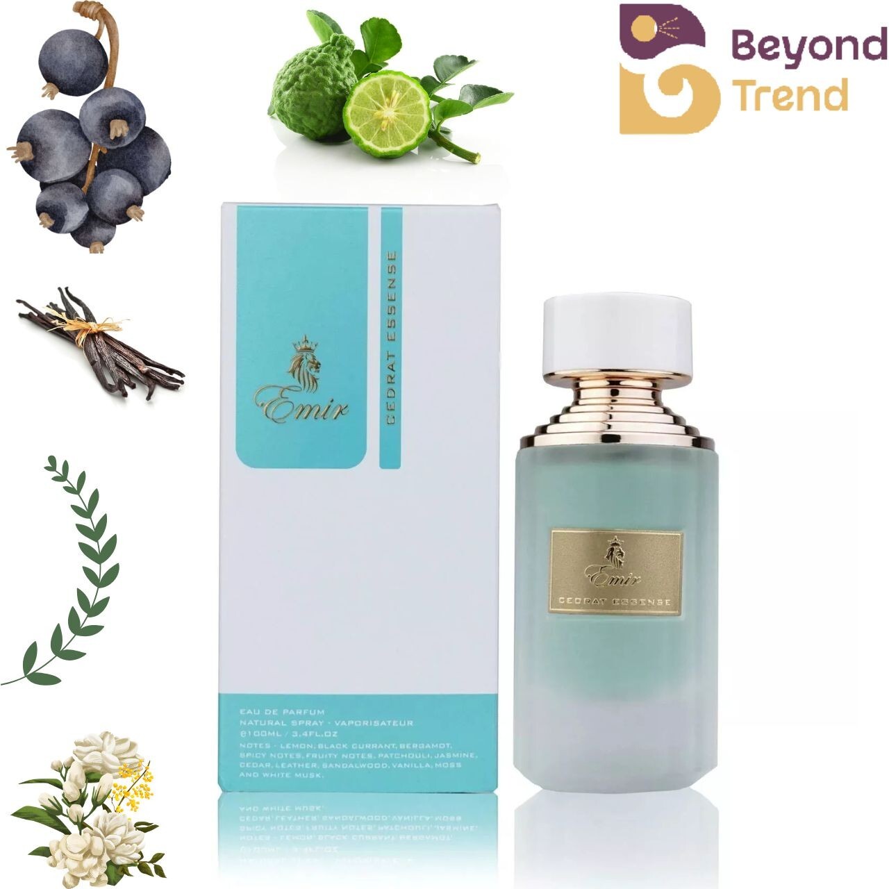 Paris Corner Cedrat Essence Emir Eau De Parfum, 75ml (2.5 fl oz) – Unisex. The inclusion of patchouli and jasmine in the heart notes introduces a subtle earthiness and floral sweetness. The base notes of cedar, leather, sandalwood, vanilla, white musk, and moss provide a warm and enduring foundation, making it suitable for all seasons.