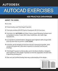 - AUTOCAD EXERCISESDo you want to learn how to design 2D and 3D models in your favorite Computer Aided Design (CAD) software such as AUTOCAD, FUSION 360 or SolidWorks? Look no further. We have designed 400 CAD exercises that will help you to test your CAD skills.What's included in the AUTOCAD EXERCISES book?Whether you are a beginner, intermediate, or an expert, these 400 CAD exercises will challenge you. The book contains 200 2D & 200 3D models and practice drawings or exercises.•Each exercise contains images of the final design and exact measurements needed to create the design.•Each exercise can be designed on any CAD software which you desire. It can be done with AutoCAD, SolidWorks, Inventor, DraftSight, Creo, Solid Edge, Catia, NX and other feature-based CAD modeling software.•It is intended to provide Drafters, Designers and Engineers with enough 2D & 3D CAD exercises for practice on AUTOCAD.•It includes almost all types of exercises that are necessary to provide, clear, concise and systematic information required on industrial machine part drawings.•Third Angle Projection is intentionally used to familiarize Drafters, Designers and Engineers in Third Angle Projection to meet the expectation of worldwide Engineering drawing print.•This book is for Beginner, Intermediate and Advance CAD users.•Clear and well drafted drawing help easy understanding of the design.•These exercises are from Basics to Advance level.•Each exercises can be assigned and designed separately.•No Exercise is a prerequisite for another. All dimensions are in mm.PrerequisiteTo design & develop models, you should have knowledge of CAD. Student should have knowledge of Orthographic views and projections. Student should have basic knowledge of engineering drawings.