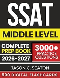 - IS YOUR CHILD READY TO SCORE HIGH—AND STAND OUT TO TOP PRIVATE SCHOOLS?Imagine your child walking into the SSAT testing room completely prepared, confident, and ready to excel.No last-minute panic. No confusion. No regrets.Just calm focus, sharp thinking, and the skills to tackle every question with confidence.That's exactly what this study guide delivers—and it's why families are choosing it as their trusted SSAT prep resource.Welcome to the most comprehensive SSAT Middle Level prep system available for the 2026-2027 exam.Whether your child is aiming for elite boarding schools, prestigious independent academies, or competitive magnet programs, this complete study guide provides everything needed to master the test and maximize their admissions potential.What's Inside This Complete System:✅ 15 full-length practice tests (3 of these printed in the guide, 12 digital download)✅ 3,000+ practice questions across all test sections✅ Answer explanations that teach problem-solving✅ Strategic test-taking techniques designed specifically for the SSAT✅ Complete content coverage for Math, Verbal, Reading, and Writing✅ Parent-student collaboration strategies throughout✅ BONUS: 500 digital vocabulary flashcardsThe guide begins by explaining what the SSAT actually measures and why mindset matters as much as content knowledge. You'll discover how to work together effectively, make vocabulary development a shared activity, and prepare for test day without last-minute panic.Comprehensive Content MasteryThe Quantitative (Math) section provides systematic instruction across all tested topics—from number operations and fractions through advanced geometry and data analysis. You'll master arithmetic fundamentals, ratios and proportions, algebraic thinking, geometric principles, measurement concepts, and probability.The Verbal section builds vocabulary strategically through word roots, prefixes, suffixes, and context clues. Master both synonym and analogy questions with proven techniques for tackling difficult vocabulary and recognizing relationship patterns. The systematic approach helps students expand their vocabulary while learning test-specific strategies.The Reading Comprehension section develops critical reading skills for every passage type. Learn active reading techniques, time management strategies, and how to answer questions about main ideas, inferences, vocabulary in context, and author's purpose. Whether analyzing fiction, poetry, or nonfiction, you'll have the tools to comprehend and respond accurately.The Writing Sample section demystifies what evaluators look for. Master both creative story prompts and personal essay questions with clear structure, organization techniques, and grammar essentials that strengthen your writing.Beyond content knowledge, this guide teaches SSAT-specific strategies that maximize performance. Learn the two-pass system for working efficiently, strategic skipping techniques, process of elimination methods, and section-specific approaches. These proven strategies help students manage time effectively and stay calm under pressure.GRAB YOUR COPY NOW!!!