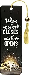- When One Book Closes, Another Opens.'' Sparks fly from the pages of the magical tome depicted on the front of this handsome black bookmark.Attached: A silky gold tassel with one large gold and two small silver metallic accent beads.Design is embellished with gloss accents.A bonus on the back: A handy printed ruler in inches and centimeters.Bookmark is printed on sturdy, smooth-finish cardstock.Bookmark is encased in a protective clear plastic sleeve.Bookmark measures 2-1/2'' wide x 7-1/8'' high.Warning: Choking hazard, small parts. Not for children under 3 years.