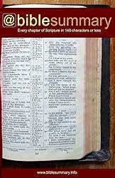• Every chapter of the Bible summarised in 140 characters or less. These summaries originally appeared as the @biblesummary project on Twitter. For three-and-a-half years, Chris Juby posted one tweet per chapter, one chapter per day to 30,000 folowers, finishing the project in November 2013. This edition is the full archive of all 1,189 summaries.