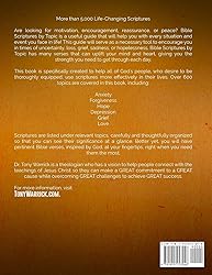 - Are you looking for a great Bible reference book? Bible Scriptures by Topic is a useful guide that will help you with every situation and event you face in life! This guide will serve as a necessary tool to encourage you in times of uncertainty, loss, grief, sadness, or hopelessness. Bible Scriptures by Topic has many verses that can uplift your mind and heart, giving you the strength, you need to get through each day. This book is specifically created to help all of God's people, who desire to be thoroughly equipped, use scriptures more effectively in their lives. Over 600 topics are covered in this book, including:AnxietyForgivenessHopeDepressionGriefLoveScriptures are listed under relevant topics, carefully and thoughtfully organized so that you can see their significance at a glance. Better yet, you will have pertinent Bible verses, inspired by God, at your fingertips, right when you need them the most. Therefore, whether you are looking for motivation, encouragement, reassurance, or peace, your first resource you turn to should be the Bible.Pick up your copy of Bible Scriptures by Topic by clicking the BUY NOW button.