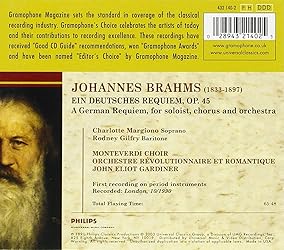 • John Eliot Gardiner, Charlotte Margiono, Rodney Gilfry, The Monteverdi Choir, Orchestre Révolutionnaire Et Romantique; Tracks: Ein Deutsches Requiem Op. 45 (Für Soli, Chor Und Orchester) / [Selig Sind, Die Da Leid Tragen] 9:50 / [Denn Alles Fleisch, Es Ist Wie Gras] 13:08 / [Herr, Lehre Doch Mich] 8:53 / [Wie Lieblich Sind Deine Wohnungen] 5:25 / [Ihr Habt Nun Traurigkeit] 7:04 / [Denn Wir Haben Hie Keine Bleibende Statt] 11:17 / [Selig Sind Die Toten, Die In Dem Herrn Sterben] 9:34