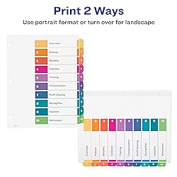 Organize tab dividers quickly with the printable table of contents sheet Easily add custom titles, graphics, and a logo to the table of contents page of your binder dividers with Avery Design & Print and the available Avery templates Dividers are paper with durable hole and tab reinforcements for long-lasting binder organization Flexible design works in either portrait or landscape orientation and is great for training manuals and project binders Multicolor divider tabs are preprinted and don't require labels or inserts