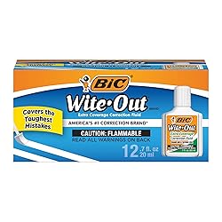 One 12-count pack of BIC Wite-Out Brand Extra Coverage Correction Fluid BIC Wite Out Brand Extra Coverage fluid covers the toughest mistakes including red ink and permanent marker America’s #1 Correction Brand**Source: The NPD Group/Retail Tracking Service and Commercial Tracking Service, U.S. based on dollar sales; 12ME June 2022 combined. BIC defines correction as including fluid, tape, and pens. Foam brush provides neat and precise corrections to cover photocopies, faxes, ink, permanent marker and more Applies evenly and dries to a satin smooth finish so you can write over it cleanly