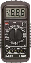 • Elenco's Deluxe Full Function Digital Multimeter Kit. Features include: Extra large 1", 3 1/2 digit display, Transistor tester, Overload protection, Capacitance to 200µF, Diode test, Audio continuity, AC/DC current to 20A, Low battery indication, Rubber holster, Tilt stand, Safety input sockets and test leads. Specifications include: AC + DC Volts: 200mV, 2V, 20V, 200V, 1000V, Accuracy: 1/2% DC, 1% AC, Resolution: 100µV, AC + DC Current: 200µA, 2mA, 20mA, 200mA, 20A, Accuracy: 1 1/2% DC, 2% AC, 20A 2.5%, Resolution: 0.1µA, Resistance: 200Ω, 2kΩ, 20kΩ, 200kΩ, 2MΩ, 20MΩ, Accuracy: 1%, 2% 20MΩ, Resolution: 0.1Ω, Capacitance: 2nF, 20nF, 200nF, 2µF, 200µF, Accuracy: 2 1/2%, 5% 200µF, Resolution: 1pF. Included Accesories: Test leads, Manual, 9V Battery.
