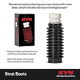 • KYB Strut Boot Kits keep your struts protected from dirt, dust, sand, salt and other road debris. These harmful elements cause abrasive wear to the polished shaft, upper seal & bushing. KYB Strut Boot Kits prevent these contaminants from entering the strut by covering the entire strut shaft in a highly durable plastic bellows. This can easily extend the life of the strut. The KYB Strut Boot Kit includes a poly foam travel-limiting bumper. It’s designed to protect the strut from bottoming out and protects other components from extreme movement damage.