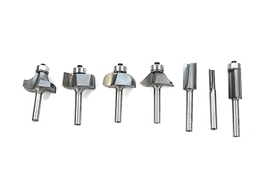 TOOL SPECS: Set includes R3/8" cove (1801), 3/8" x 1/2" rabbet (1900), R3/8" roundover (2003), 45 degree chamfer (2302), 1/4" straight (1013), 1/2" straight (1026), and 1/2" flush trim (2402). SEVEN TOOLS: Includes seven of the most commonly used 1/4" shank bits for versatile and efficient routing. APPLICATION RANGE: Includes a 3/8" radius Cove bit, a 3/8"x1/2" Rabbet bit, 3/8" Roundover bit, 45° Chamfer bit, 1/4" Straight bit, 1/2" Straight Bit, and 1/2" Flush Trim Bit. PROTECTIVE CASE: Stored in a durable, hardened plastic case for easy organization and transport. MATERIALS:For use on natural woods, composite woods, and hard plastics, providing clean and precise cuts across a variety of surfaces.