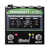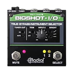 - Instrument Selector. Made by Radial Engineering.The Radial BigShot i/o is an easy to use instrument selector switch that lets you quickly transition between any two instruments and drive the signal to your amp. Because the i/o is 100% true-bypass, it addresses the needs of the most demanding purist. To further enhance connectivity, input-B is equipped with a level control called DIM that lets you reduce the signal from the louder of your two instruments so that both instruments are matched to the same volume level when they reach the amplifier. When passive instruments are used, a unique 'bright' switch lets you compensate for high frequency loss due to longer cables. To enhance on-stage functionality, the BigShot i/o is equipped with a tuner output. With a simple foot stomp on the MUTE switch, the sound going to the amp is turned off and diverted to the tuner for quiet on-stage adjustments. An 'always on' switch also permits on-the-fly quiet tuning should you wish to have the tuner on at all times. Compact, extremely rugged and completely passive, the BigShot i/o does not require any powering to make it work. This makes it ideal for pedalboards where the use of batteries or power supplies is painful! The BigShot i/o is also perfect for all you instruments and hi-Z line-level signal switching.Features:Toggle two instruments with single foot stomp Adjustable volume control to match levels Separate tuner output and mute switch Compact and rugged for pedalboards Load compensation for long cables