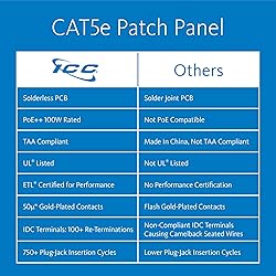 HIGH-PERFORMANCE CONNECTIVITY: Wall-mounted CAT5e component-rated fixed patch panel with an 89D wall mount bracket, delivering excellent performance for data networks requiring maximum speed and bandwidth. Backward compatible with all lower rated category components. FUTURE-PROOF AND RELIABLE: Designed for Gigabit Ethernet, ensuring your network is future-proof. Ideal for Gigabit Ethernet switches. Gold-plated contacts ensure a correction-free connection with 50 micro-inches of gold over 100 micro-inches of nickel. Supports Power over Ethernet (PoE) up to 90W. EFFICIENT INSTALLATION AND QUICK REFERENCE: Features 110 IDC termination to reduce installation time. The 110 IDC on the rear can be re-terminated over 100 times. Numbered ports and color-coded TIA-568A and TIA-568B wiring diagrams provide quick and easy reference. DURABLE MATERIALS AND SAFETY COMPLIANCE: Jack housing constructed from high-impact, flame-retardant plastic (UL 94V-0 rated) and durable phosphor bronze spring wire. Phosphor bronze alloy 110 connectors with 100 micro-inches of nickel alloy. RJ45 jack can accept over 750 plug to jack insertion cycles. UL listed for fire safety compliance. ENHANCED CROSSTALK CANCELLATION: Engineered to exceed ANSI/TIA-568 Category 5e connecting hardware requirements with enhanced crosstalk cancellation, reducing return loss and improving overall network performance.