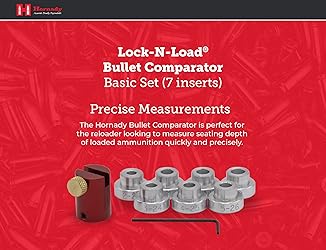 Hornady Comparator Kit – The Hornady Lock-N-Load Bullet Comparator is perfect for the reloader looking to measure seating depth of loaded ammunition quickly and precisely. Measures from the bullet ogive to the base of the loaded round, to eliminate variation in seating depth. This basic set includes 7 bullet inserts Why Do You Need a Hornady Bullet Comparator – Measuring cartridge lengths across the bullet tips is not a reliable (or repeatable) method for measuring loaded rounds. It’s common for variations of up to .025” to exist from one round to the next Reliable Rounds – Our Bullet Comparator measures rounds from the ogive to provide consistent, precise measurements. You can also use it to check uniformity of bullets from base to ogive Easy Measuring – Our Bullet Comparator easily attaches to the blade of your caliper and uses interchangeable inserts (available in sizes from .17 caliber to .45 caliber) to measure from the bullet ogive Kit Includes – Comparator body and 7 comparator inserts for the following diameter bullets: 224, 243, 257, 264, 277, 284 and 308. Allen Wrench also included. Other inserts sold separately. To position the comparator with the Hornady Lock-N-Load Overall Length Gauge, install comparator body to the caliper with the screw through the thicker leg of the body. This allows the proper off center alignment of the Length Gauge