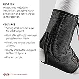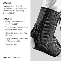 COMFORTABLE PROTECTION: McDavid Ankle Brace is the perfect support to help prevent or recover from common ankle injuries and fits over any sock SUPPORTIVE & BREATHABLE DESIGN: Our design simulates athletic tape with laces to support you on and off the fields. With a ventilated tongue, your foot will able to breathe while reaching peak performance DURABLE & MADE TO LAST: Includes spring steel medical stays for solid support throughout the brace to provide unmatched support and durability. Also features reinforced eyelets to a secure fit. FIND THE RIGHT FIT: This ankle brace is intended to fit tightly for the best support. If your measurements are close to the maximum size range, we recommend sizing up for comfort. Fits men & women GAME-CHANGING ADVANCEMENTS: McDavid is the First-On-Last-Off choice for athletes looking to enhance performance, increase protection, and accelerate relief and recovery, striving to be a must-have factor in every athlete's training and competition