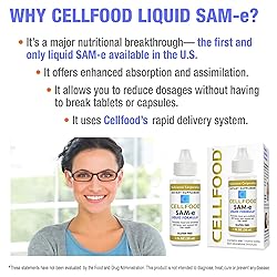 Major Nutritional Breakthrough; This supplement is a high-quality liquid SAM-e formulation with enhanced absorption and assimilation, supported by the powerful Cellfood delivery system Joint Support; SAM-e supports sulfate groups' absorption into glycoproteins, which help maintain cartilage & protect joints; Cysteine & glutathione are byproducts of this absorption process and have potent health-optimizing properties Liver Health; Cellfood SAM-e supports glutathione production and uptake, helping the liver keep the cells of the body clean for optimum function Tested & Trusted; For over 50 years, Cellfood's proprietary formula has been manufactured by NuScience Corporation in an FDA-compliant facility, GMP-certified by the prestigious Natural Products Association and Underwriters Laboratories