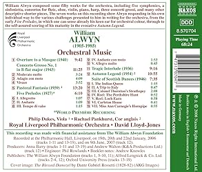• William Alwyn composed some fifty works for the orchestra, including five symphonies, a sinfonietta, concertos for flute, oboe, violin, piano, harp, three concerti grossi, and many other descriptive shorter pieces.