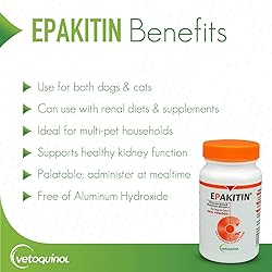 • In animals with CRF, (Chronic Renal Failure) it is recommended to use a low phosphorus diet. Epakitin, a new nutritional supplement from Vétoquinol USA, Inc., safely and effectively supports kidney function and helps slow down the progression of chronic kidney disease. Helps pets feel better and live longer. Great-tasting, easy-to-administer powder. Can be used alone, mixed with regular food or in combination with a prescription renal diet. Ingredients: Lactose, Calcium Carbonate, Chitosan. Usage: Administer orally 1 g of Epakitin per 5 kg of body weight, twice daily included with a meal, to support dogs and cats with impaired kidney function. One level spoonful with the measuring spoon supplied within, provides 1 g of Epakitin. Make certain that the animal always has access to fresh drinking water.