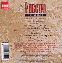 - All of Puccini's popular operas are represented in this 17-CD boxed set, as well as the less frequently heard titles La Rondine, La Fanciulla del West, and Il Trittico. Also included are highlights from Le Villi, an early work by Puccini that is almost never performed. The recordings (all stereo) come from EMI's unrivalled operatic catalog and feature some of the greatest stars in the world of opera, including: Montserrat Caballé and Plácido Domingo in Manon Lescaut; Mirella Freni and Nicolai Gedda in La Bohème; Maria Callas, Carlo Bergonzi, and Tito Gobbi in Tosca; Victoria de los Ángeles and Jussi Björling in Madama Butterfly; Roberto Alagna and Angela Gheorghiu in La Rondine; Neil Shicoff and Maria Guleghina in Il Tabarro (from Il Trittico); Tito Gobbi and Victoria de los Ángeles in Gianni Schicchi (from Il Trittico); Birgit Nilsson in La Fanciulla del West; and more!