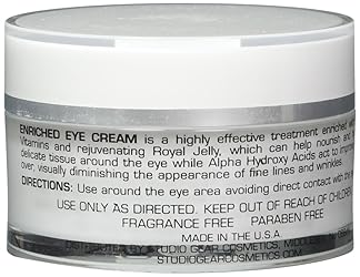 - Studio Gear Cosmetics Enriched Eye Cream is a highly effective treatment enriched with proteins, vitamins and rejuvenating Royal Jelly, which helps to nourish and hydrate the delicate tissue around the eye. Alpha Hydroxy Acids act to improve cell turn-over, visually diminishing the appearance of fine lines and wrinkles. Key Benefits Nourish and hydrates around the eye Alpha Hydroxy Acids provide anti-aging benefits Enriched with proteins, vitamins and rejuvenating Royal Jelly Made in the USA